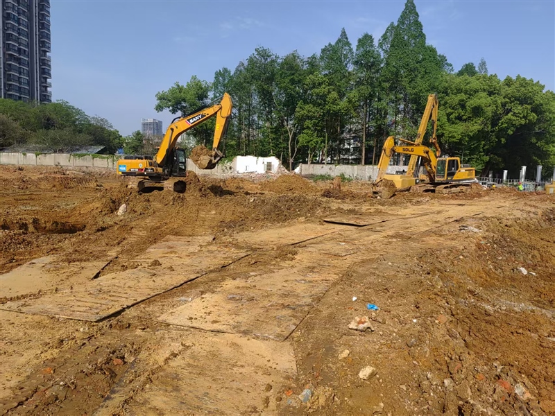 挖掘機、運輸車來回穿梭,